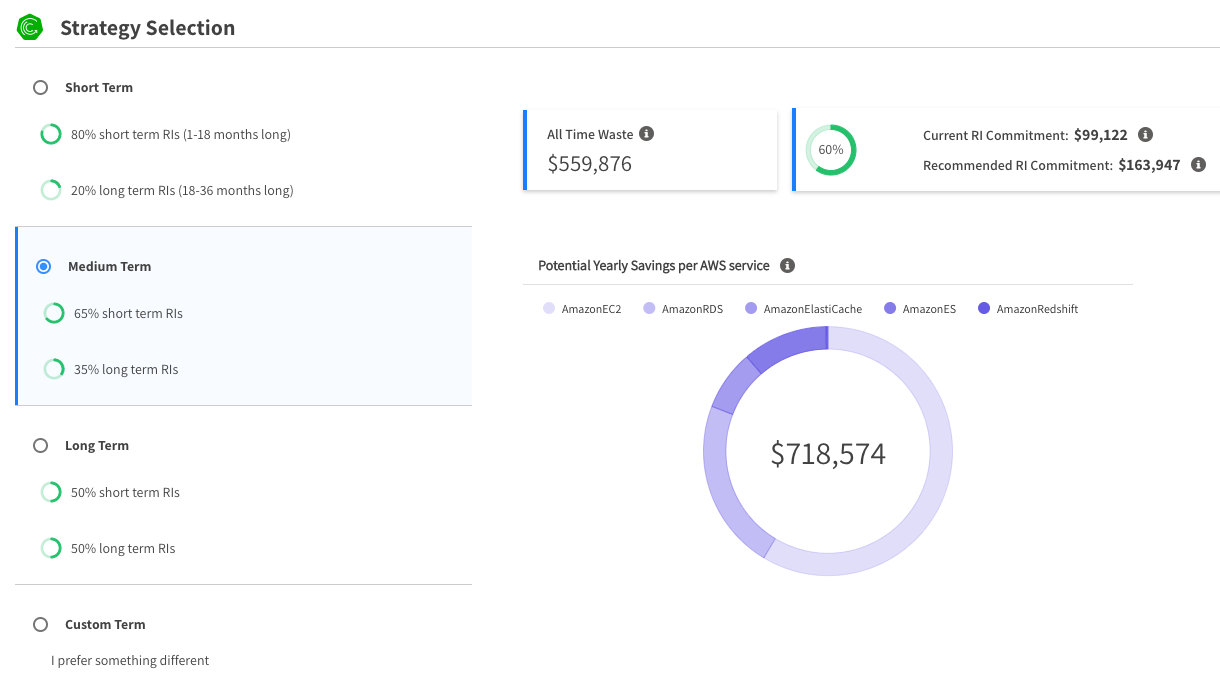 After you click Choose Strategy in the Dashboard’s Analysis page (Eco AWS), select a reserved instance (RI) strategy in the Strategy Selection page.
