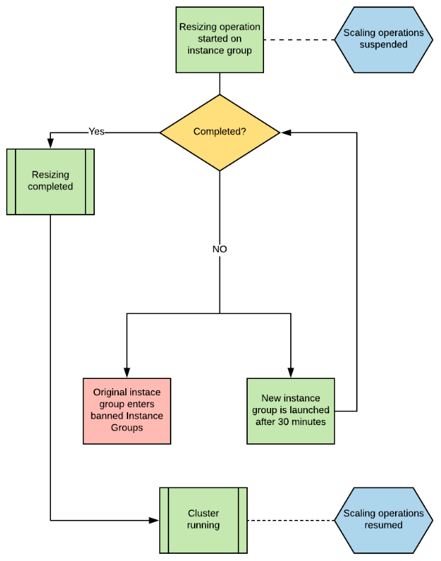 When a change in instance group capacity is applied, a process will monitor its status and if the time limit of 30 minutes is exceeded, Spot Elastigroup will automatically stop the resizing process on the specific instance group and will create a new instance group with the same configuration which we will fall back to.